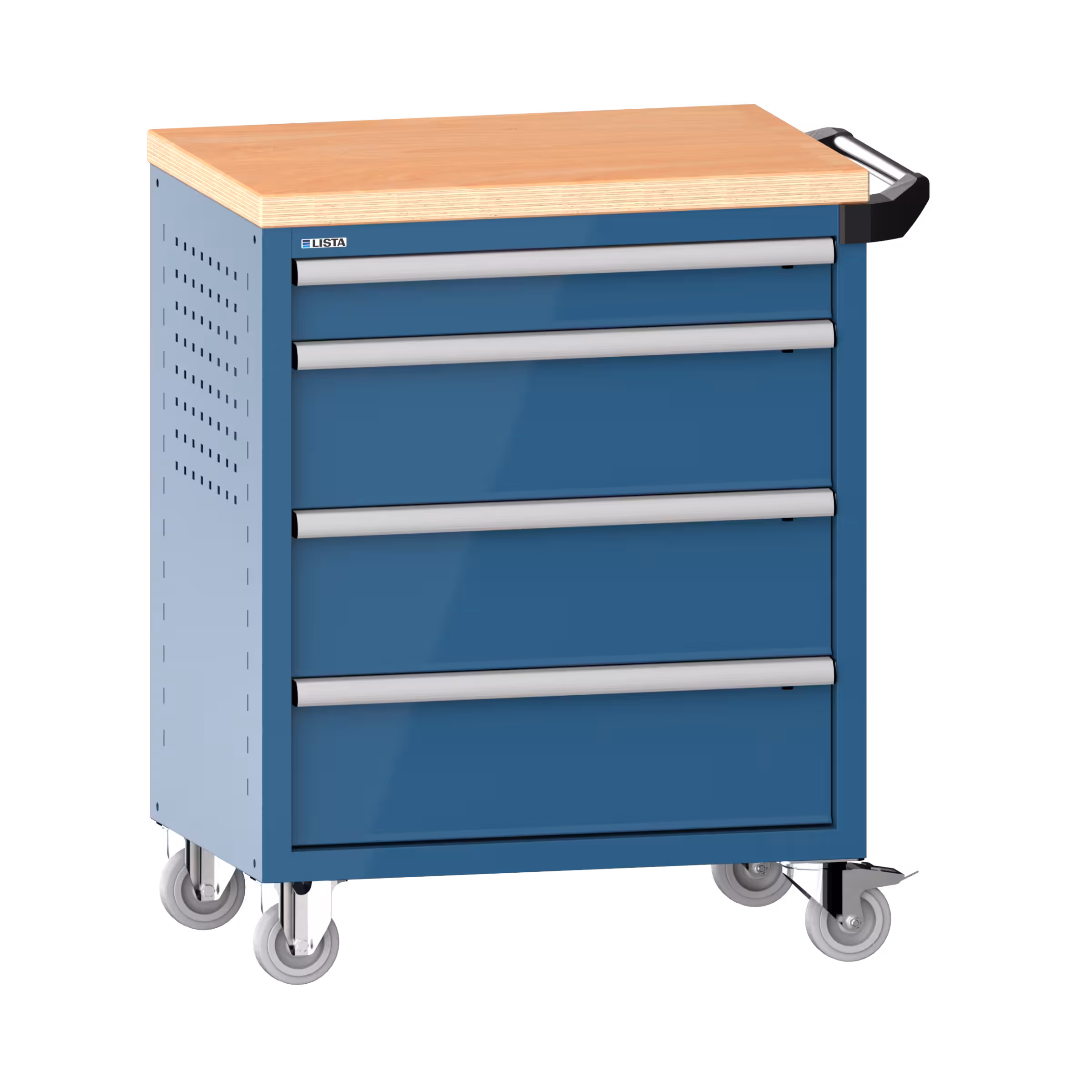 Werkstattwagen 36x27E (BxTxH) 833x525x945mm 4 Schubladen (1x100/3x200) 40kg mit Holzabdeckung Einzelsicherung rechts KEY Lock Brillantblau RAL 5007