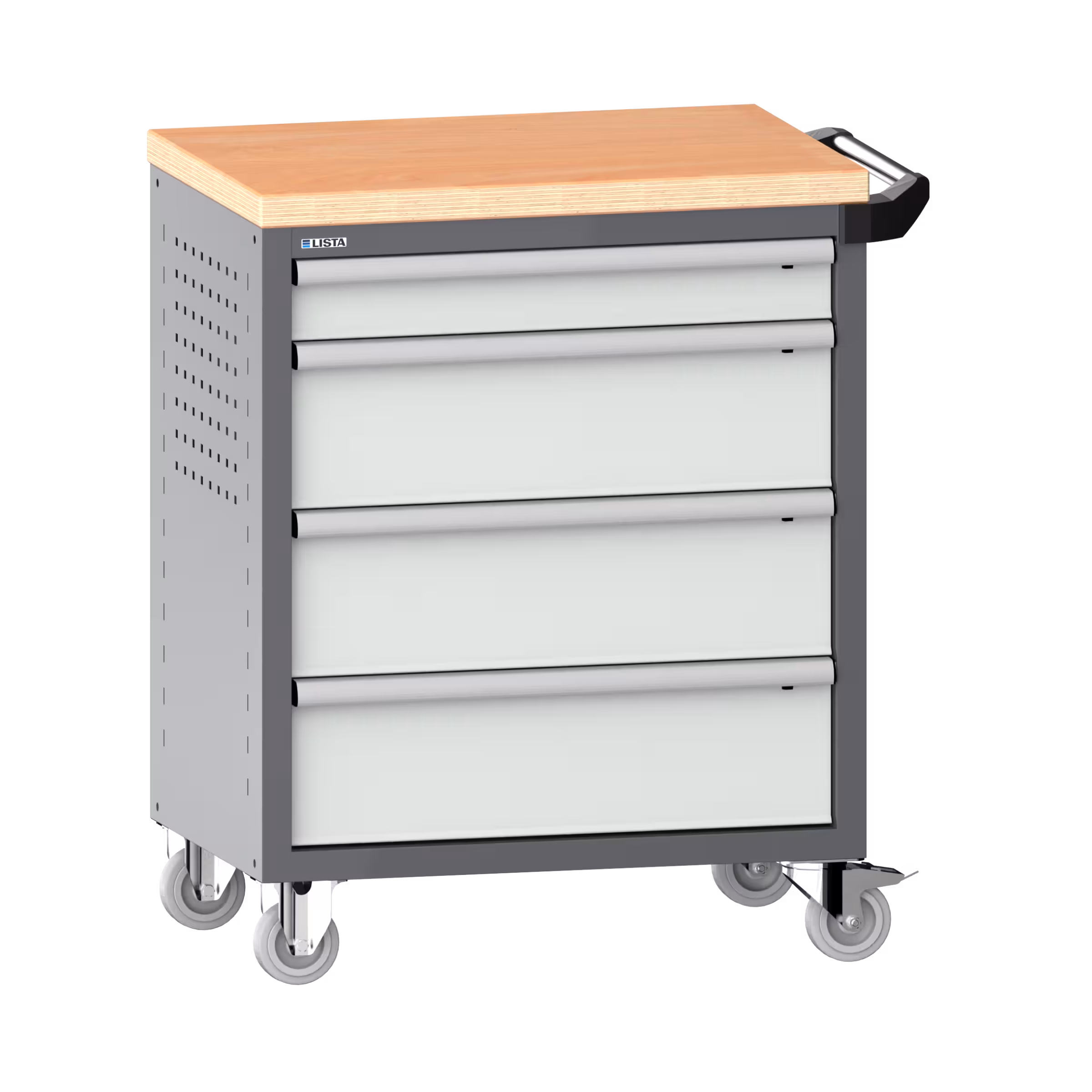 Werkstattwagen 36x27E (BxTxH) 833x525x945mm 4 Schubladen (1x100/3x200) 40kg mit Holzabdeckung Einzelsicherung rechts KEY Lock Grau metallic NCS S 6502-B / Lichtgrau RAL 7035