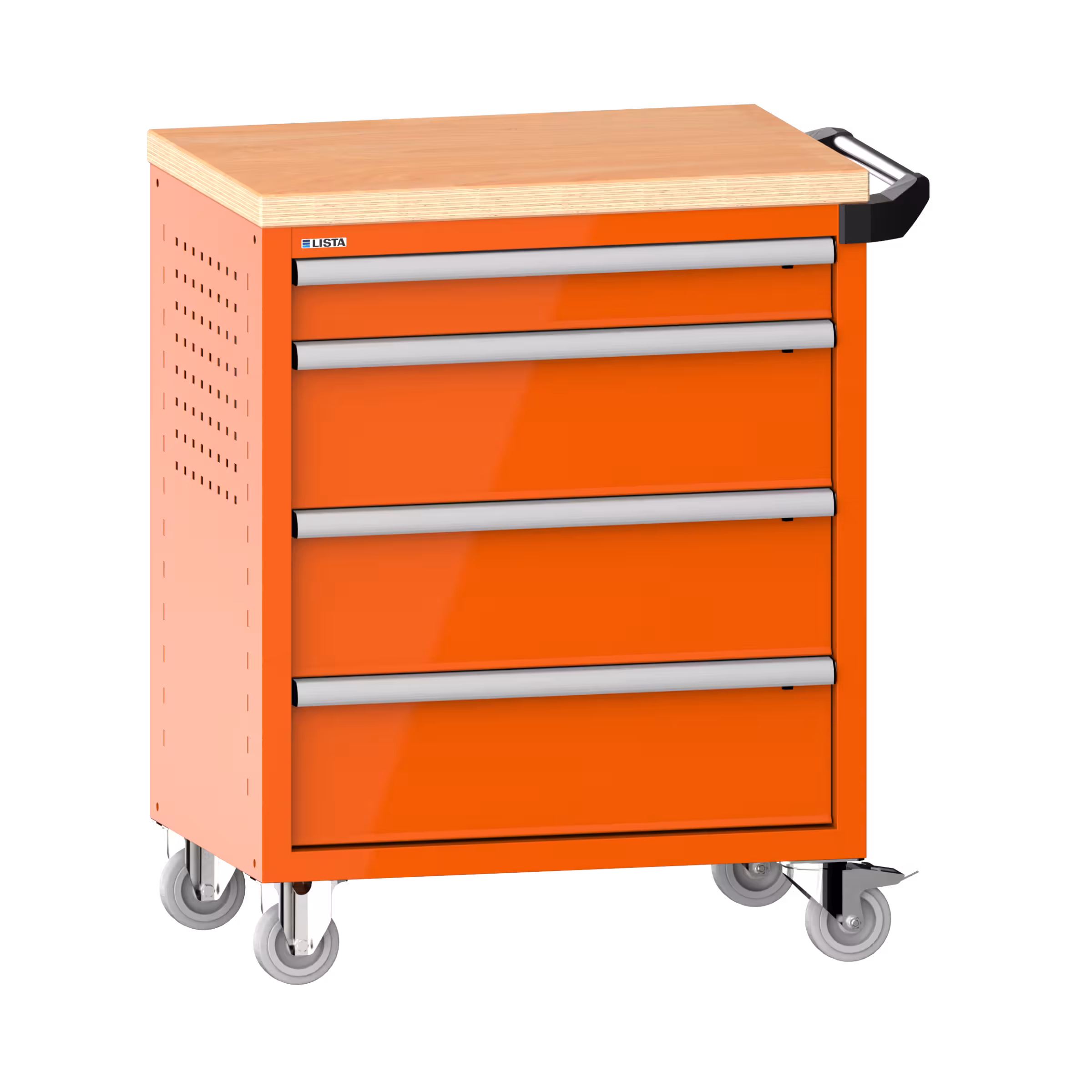Werkstattwagen 36x27E (BxTxH) 833x525x945mm 4 Schubladen (1x100/3x200) 40kg mit Holzabdeckung Einzelsicherung rechts KEY Lock Orange RAL 2004