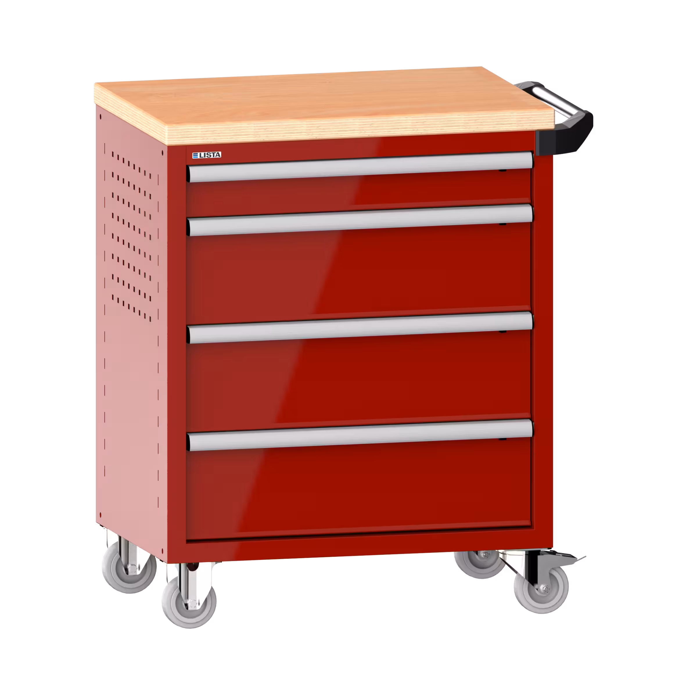 Werkstattwagen 36x27E (BxTxH) 833x525x945mm 4 Schubladen (1x100/3x200) 40kg mit Holzabdeckung Einzelsicherung rechts KEY Lock Rubinrot RAL 3003