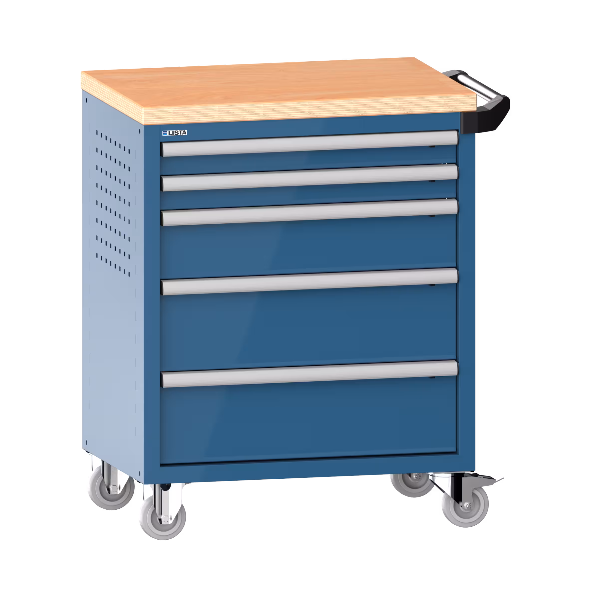 Werkstattwagen 36x27E (BxTxH) 833x525x945mm 5 Schubladen (2x75/1x150/2x200) 40kg mit Holzabdeckung Einzelsicherung rechts KEY Lock Brillantblau RAL 5007