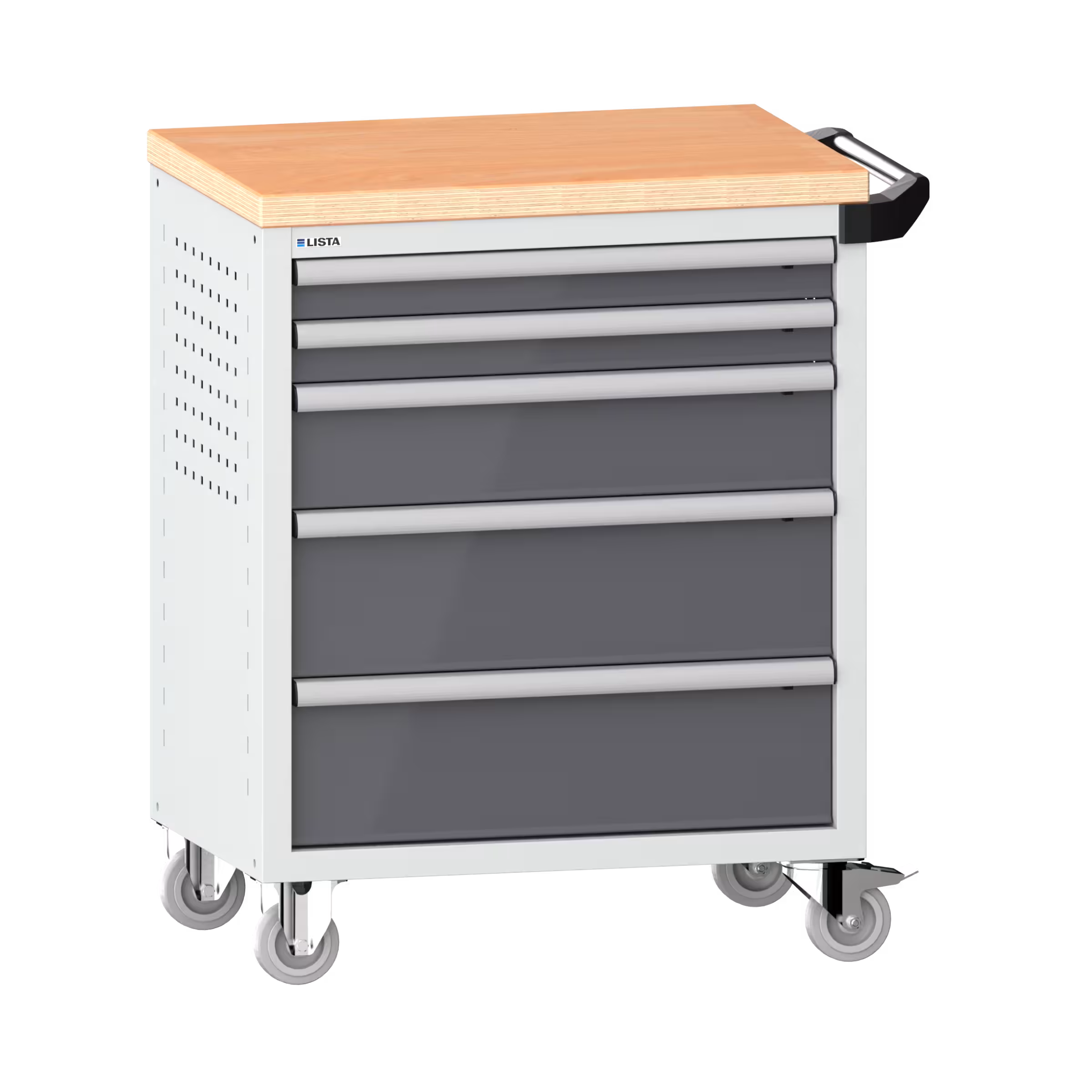 Werkstattwagen 36x27E (BxTxH) 833x525x945mm 5 Schubladen (2x75/1x150/2x200) 40kg mit Holzabdeckung Einzelsicherung rechts KEY Lock Lichtgrau RAL 7035 / Grau metallic NCS S 6502-B
