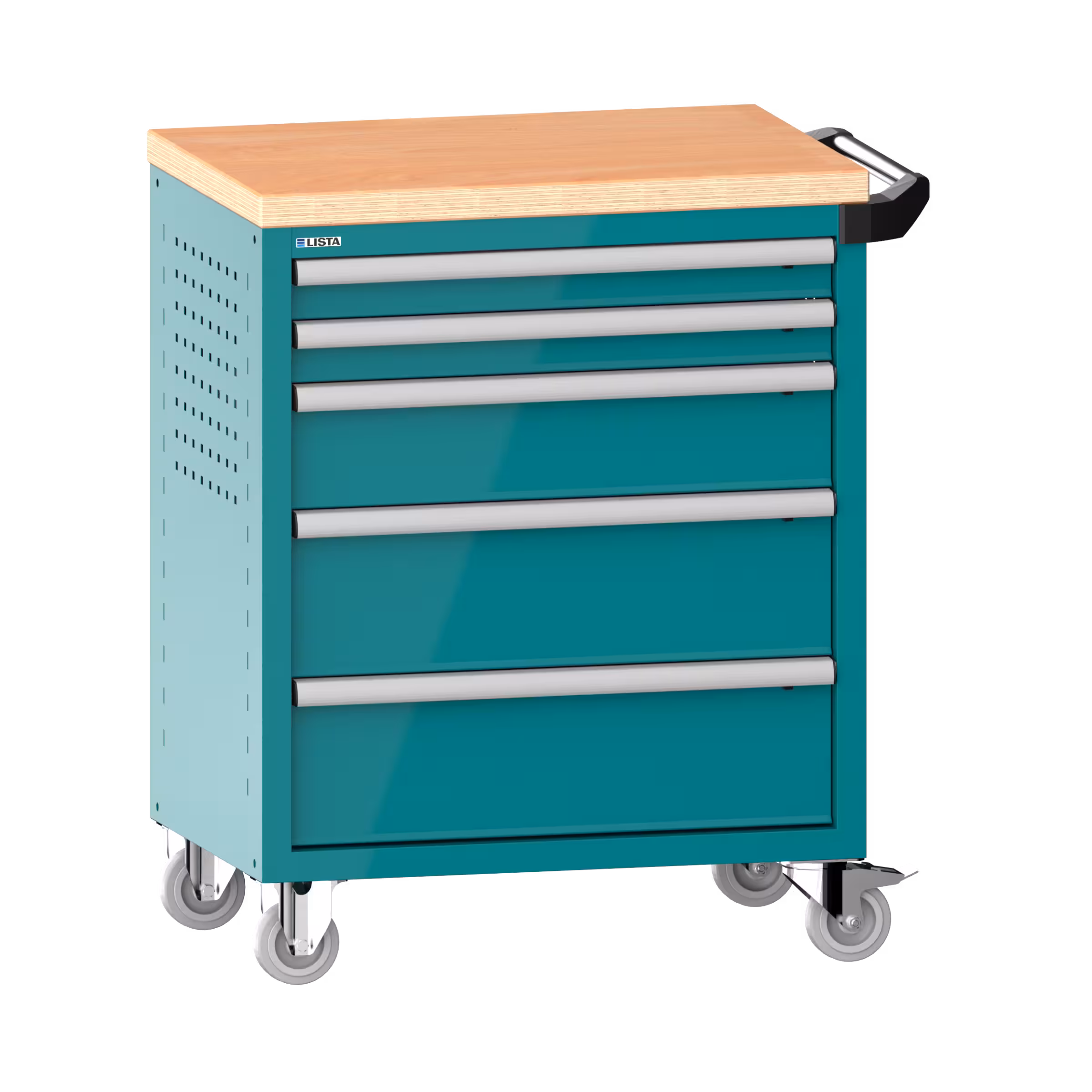 Werkstattwagen 36x27E (BxTxH) 833x525x945mm 5 Schubladen (2x75/1x150/2x200) 40kg mit Holzabdeckung Einzelsicherung rechts KEY Lock Türkisblau RAL 5018