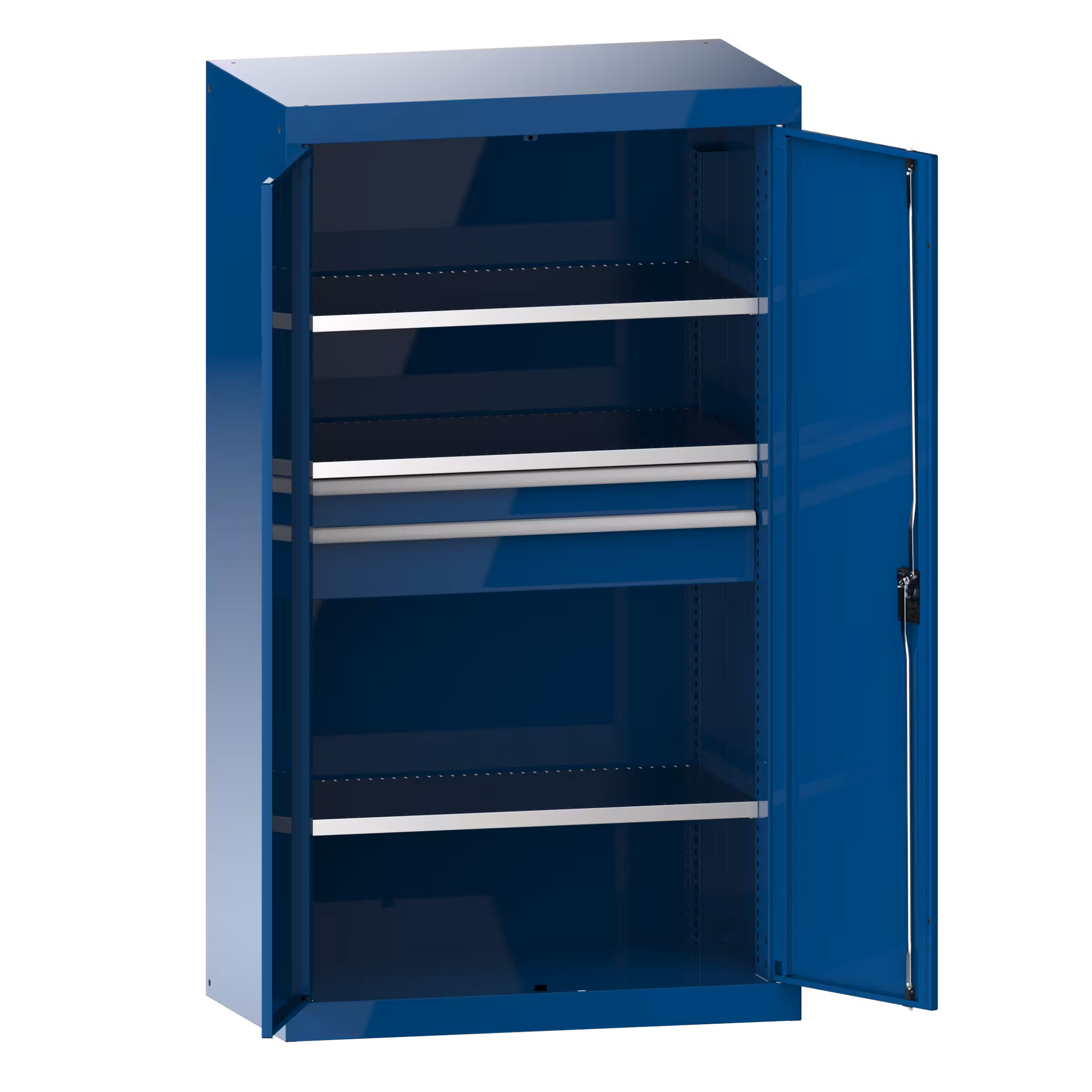 Heavy-duty cabinets with hinged doors: The cabinets are fitted with: adjustable shelves, galvanised, 35 mm thick, pull-out shelves and drawers, painted, generally grey, NCS 4502-B. Hinged doors folded from one piece, optionally either in solid sheet or with viewing windows. KEY, CODE or RFID locks available.