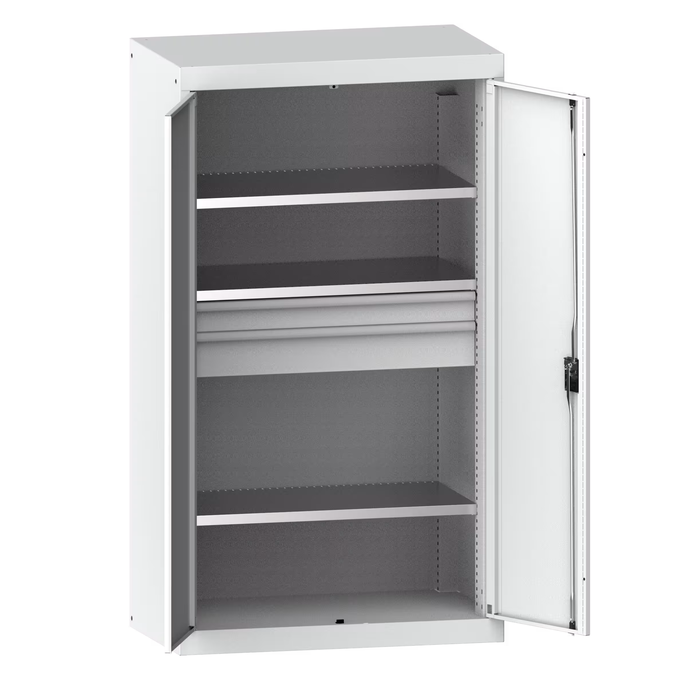 Heavy-duty cabinet with solid sheet hinged doors 54x27E (WxDxH) 1100x641x1950mm 3 shelves, 2 drawers KEY Lock Light grey RAL 7035