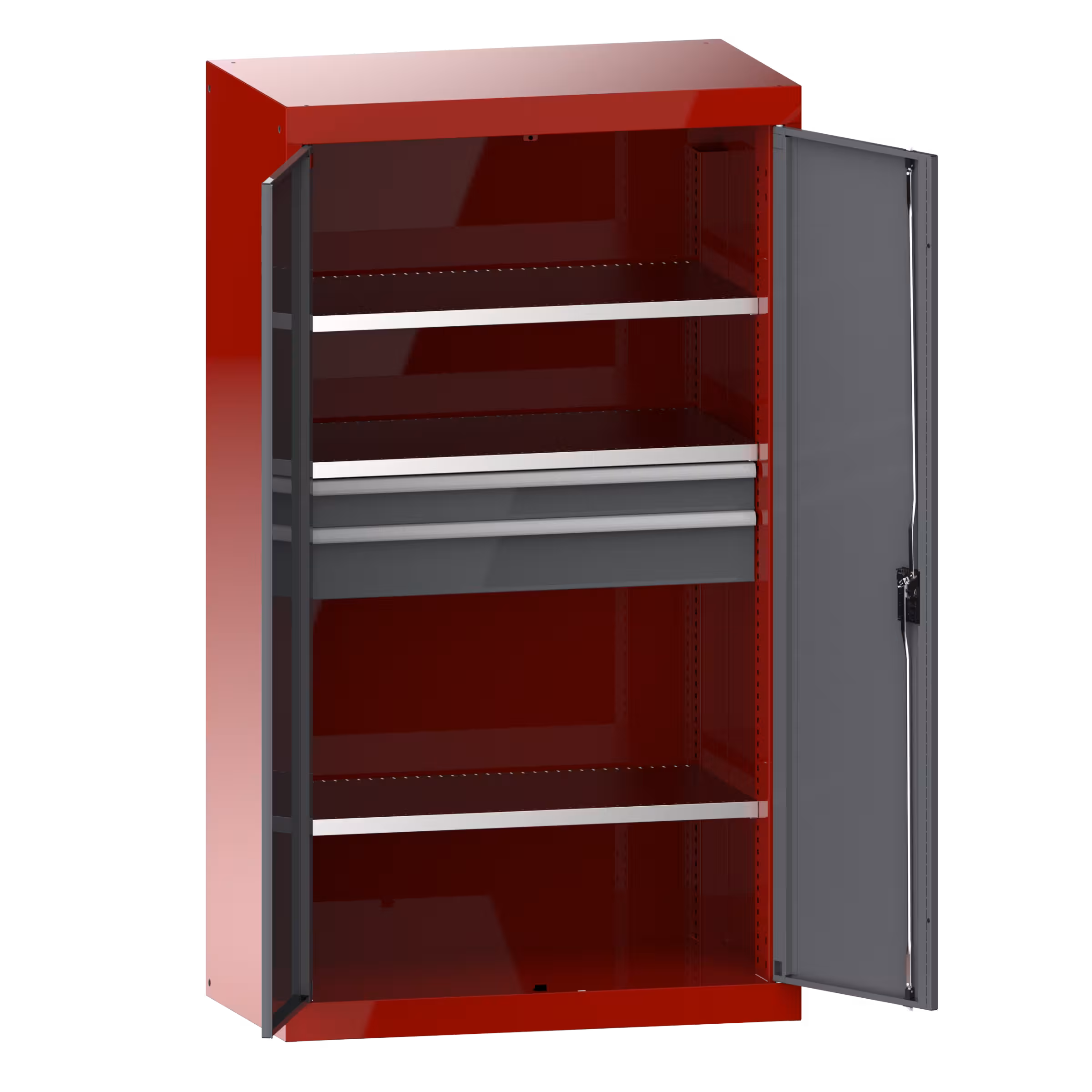 Heavy-duty cabinet with solid sheet hinged doors 54x27E (WxDxH) 1100x641x1950mm 3 shelves, 2 drawers KEY Lock Ruby red RAL 3003 / Grey metallic NCS S 6502-B