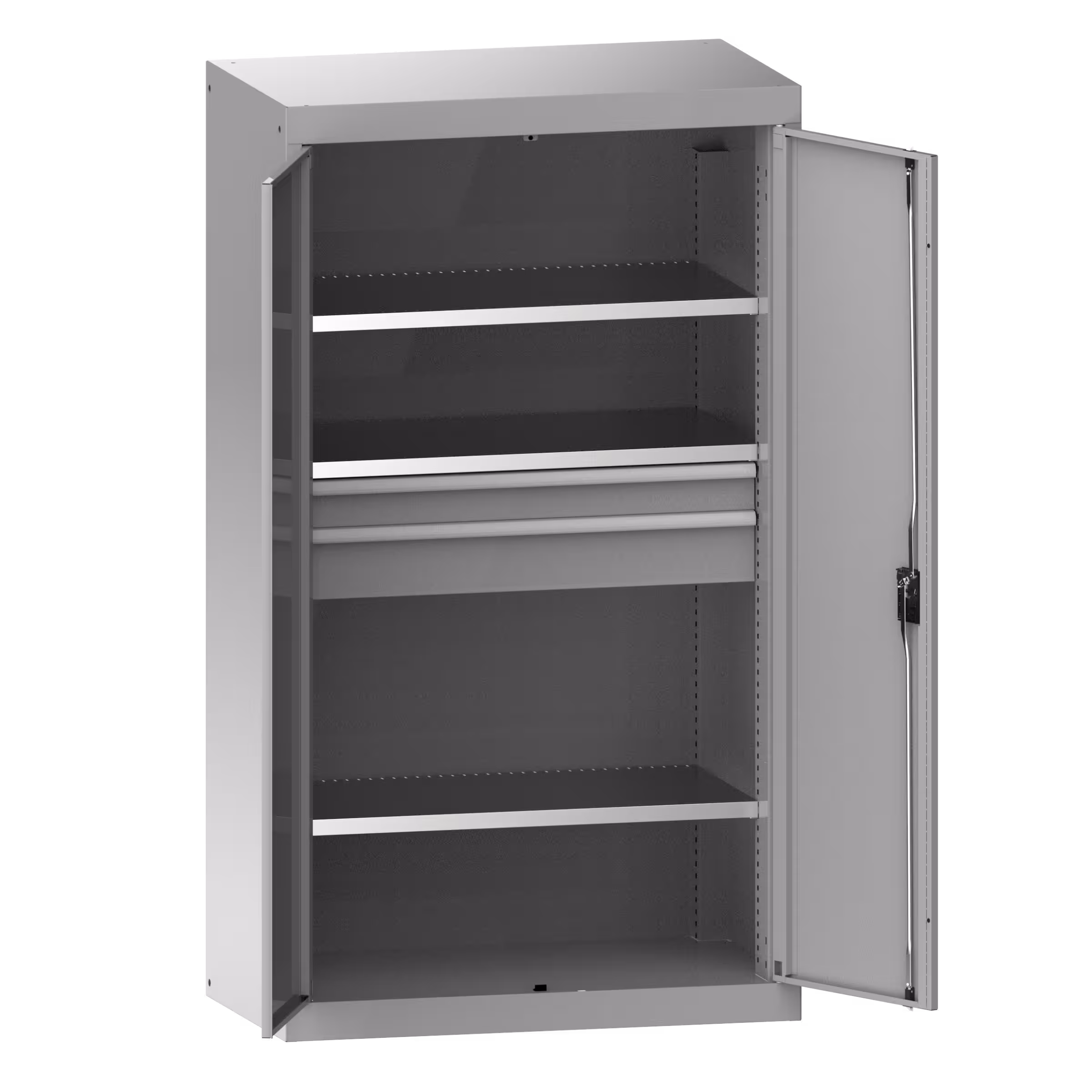 Heavy-duty cabinets with hinged doors: The cabinets are fitted with: adjustable shelves, galvanised, 35 mm thick, pull-out shelves and drawers, painted, generally grey, NCS 4502-B. Hinged doors folded from one piece, optionally either in solid sheet or with viewing windows. KEY, CODE or RFID locks available.