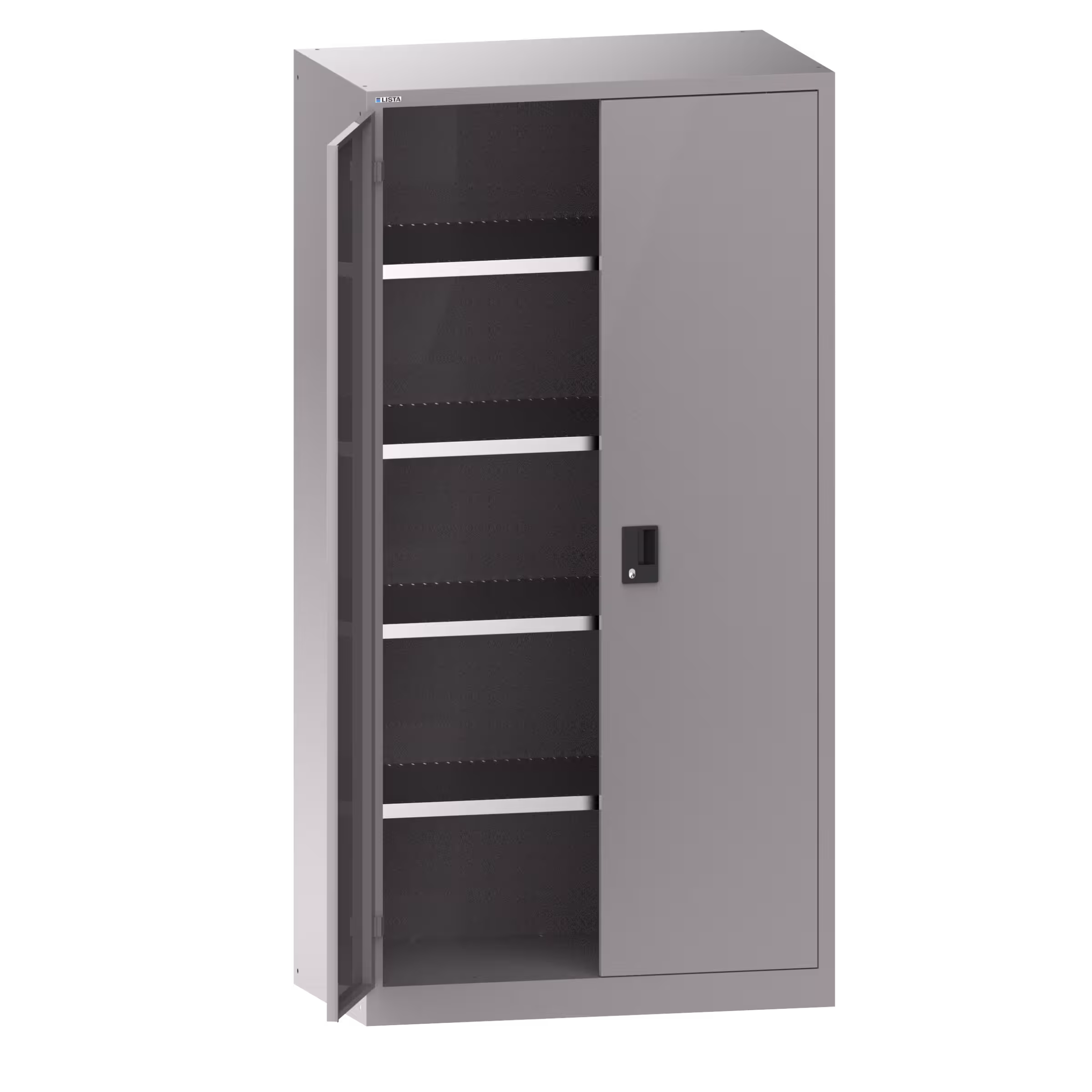 Hinged door cabinets: Depending on the model, the cabinets are equipped with: galvanised adjustable shelves, 30 mm thick, load capacity 60 kg. Pull-out shelves and drawers painted, anthracite grey, RAL 7016, load capacity 50 kg