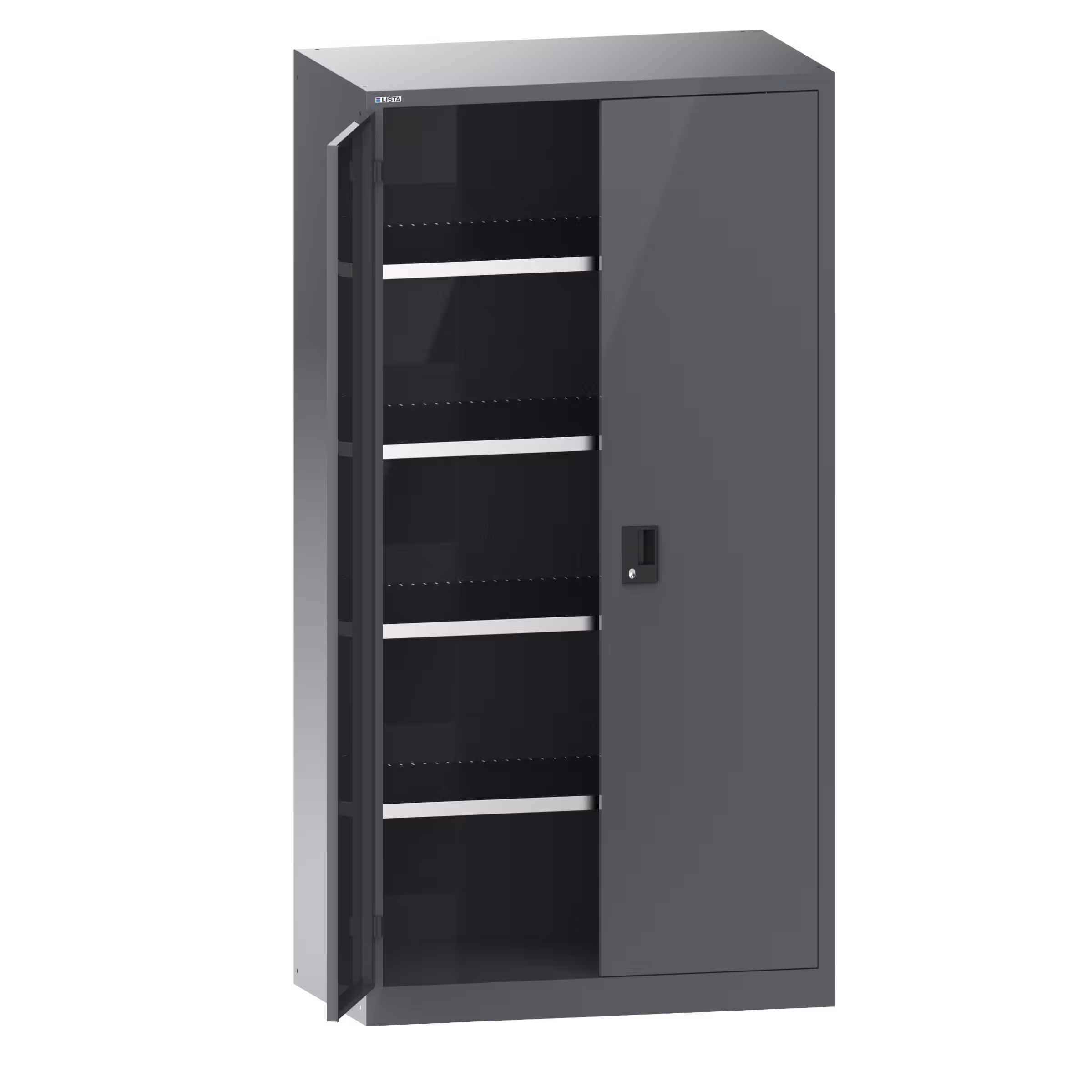 Hinged door cabinets: Depending on the model, the cabinets are equipped with: galvanised adjustable shelves, 30 mm thick, load capacity 60 kg. Pull-out shelves and drawers painted, anthracite grey, RAL 7016, load capacity 50 kg