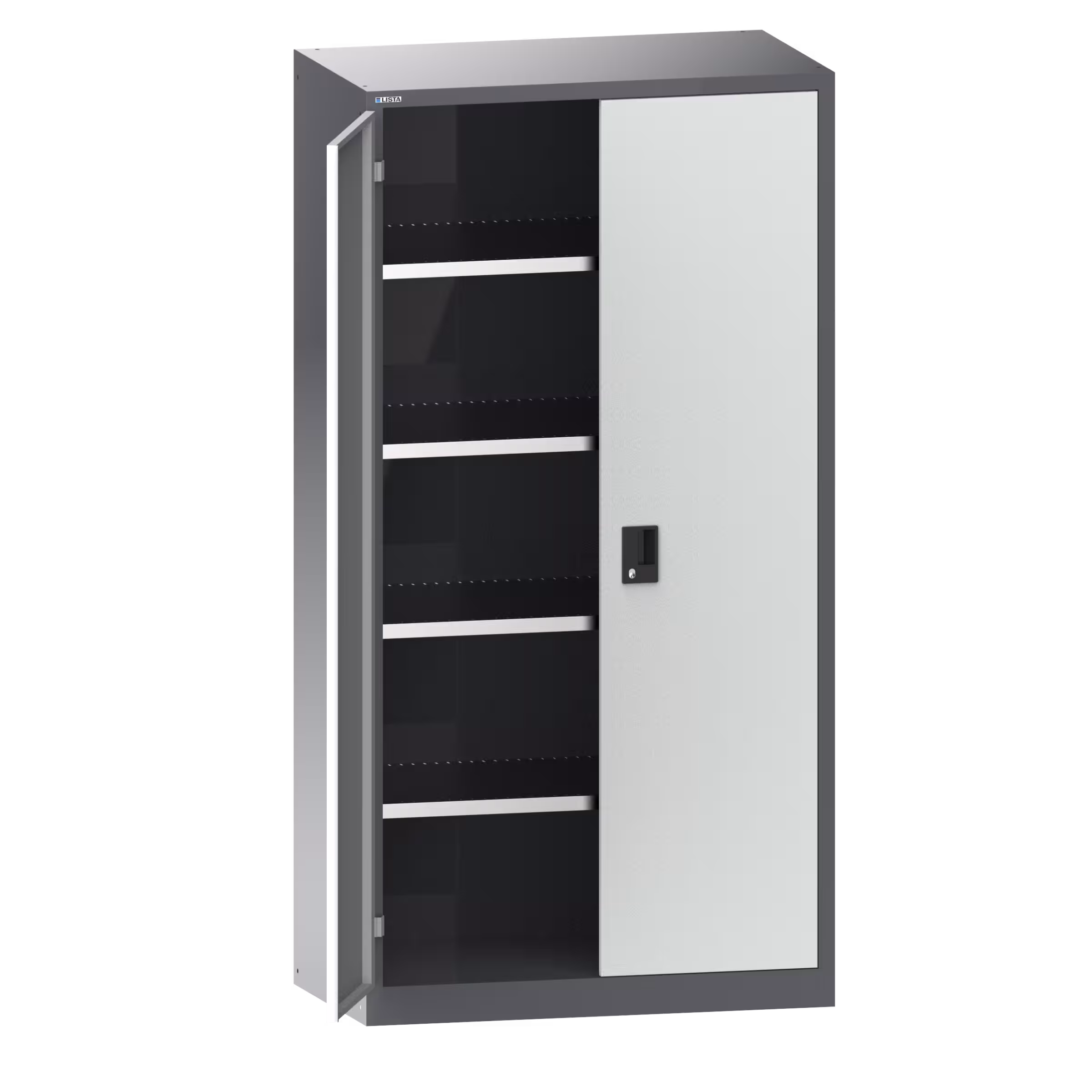 Hinged door cabinets: Depending on the model, the cabinets are equipped with: galvanised adjustable shelves, 30 mm thick, load capacity 60 kg. Pull-out shelves and drawers painted, anthracite grey, RAL 7016, load capacity 50 kg