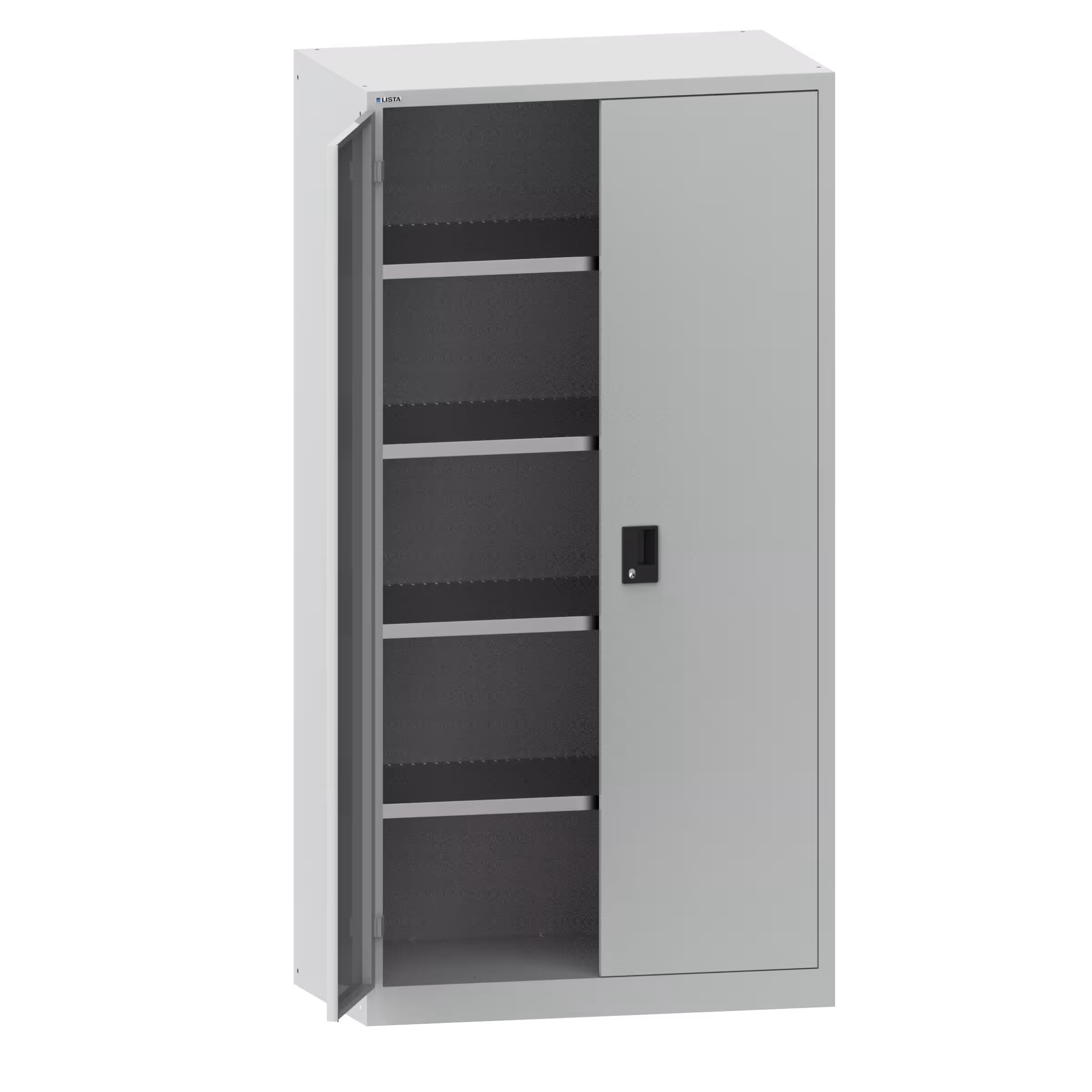 Hinged door cabinet with 2 solid sheet doors hinge mounted (WxDxH) 1000x580x1950mm 4 shelves KEY Lock Pale grey NCS S 2000-N