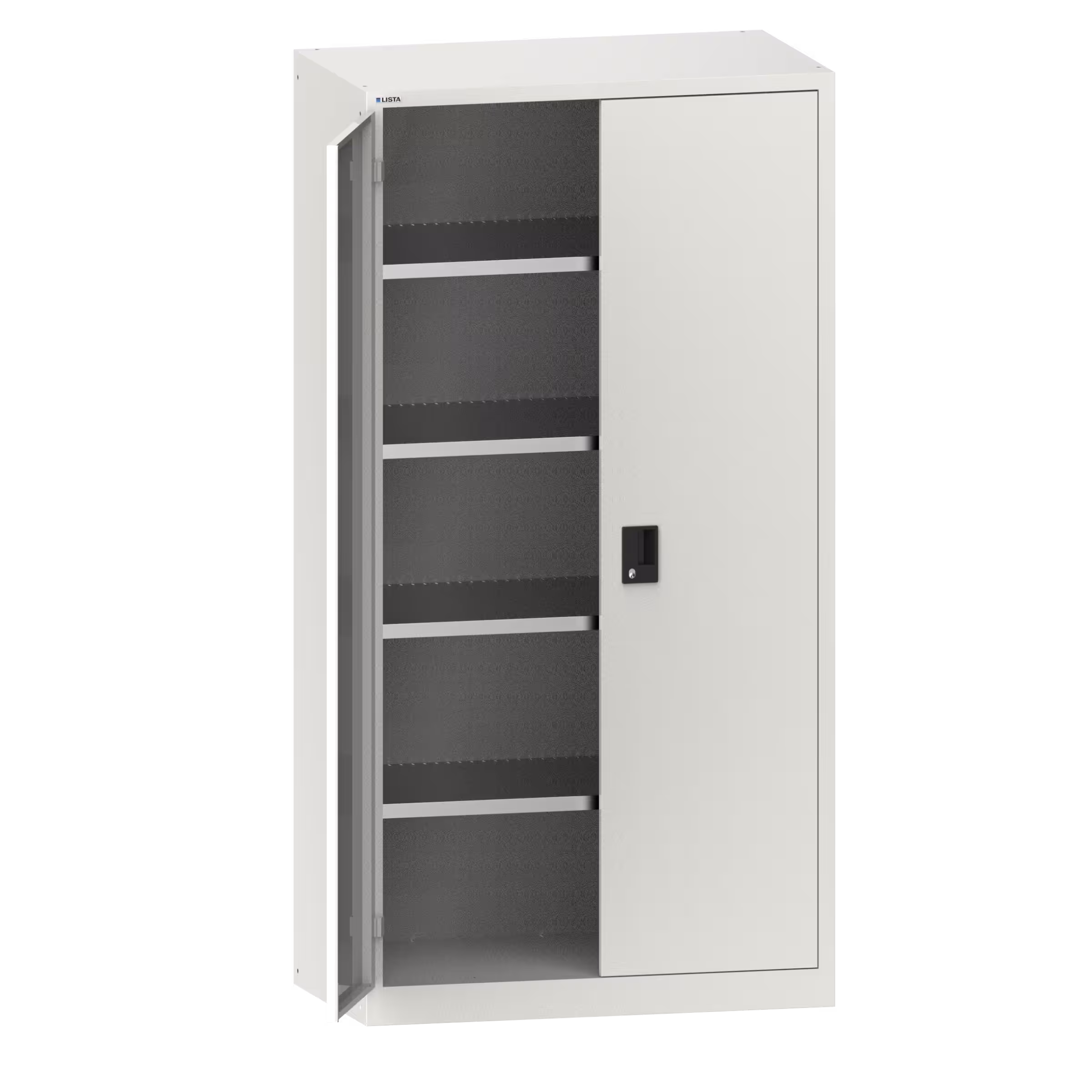Hinged door cabinet with 2 solid sheet doors hinge mounted (WxDxH) 1000x580x1950mm 4 shelves KEY Lock Pure white RAL 9010