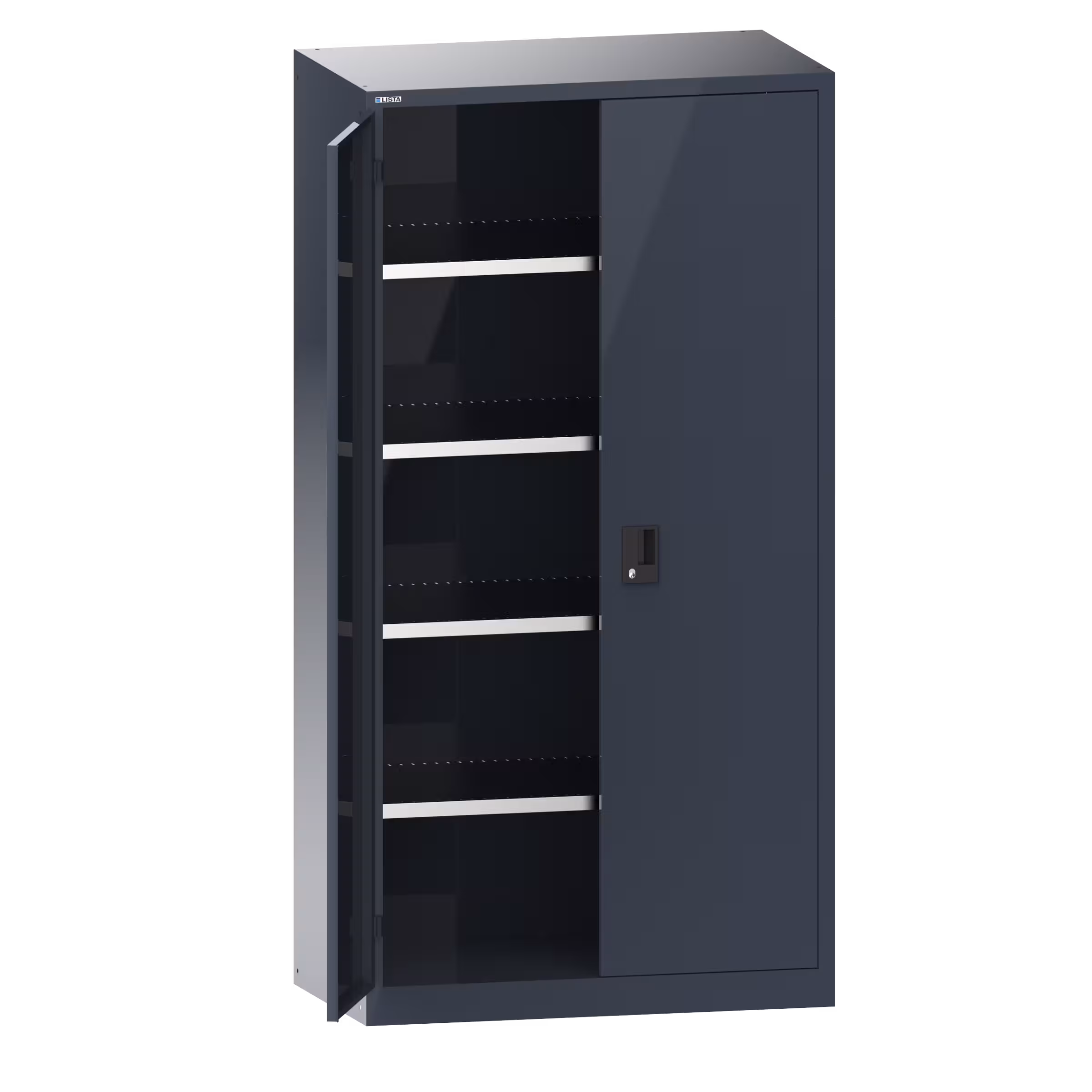 Hinged door cabinet with 2 solid sheet doors hinge mounted (WxDxH) 1000x580x1950mm 4 shelves KEY Lock Slate grey RAL 7015