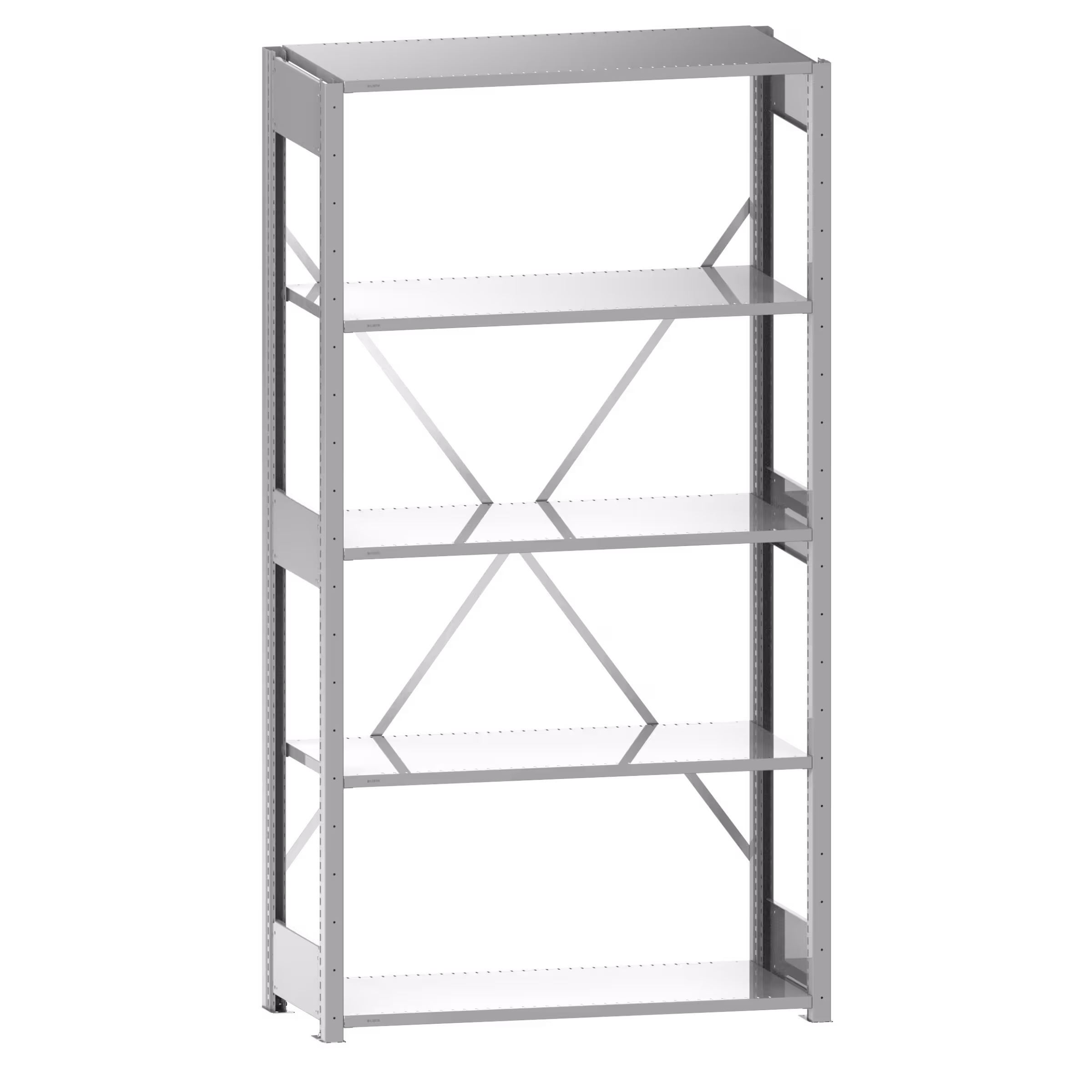 Shelves, plain or slotted, max. shelf load 80, 160, 220, 280 and 400 kg: Shelf supports included. Shelf thickness 25 mm. Specification: sheet steel. Colour: according to colour chart or galvanised.